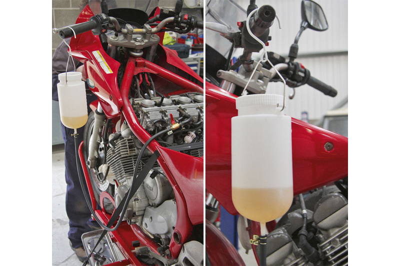 Simply remove your tank, connect the auxiliary fuel tank, which is gravity fed, and hang it up using the hook provided.
