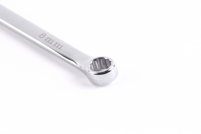 6-point/12-point/all drive function on ring side available. Regular/quick function on open side available .15º on ring sides and open side. Size: 8 mm. Length: 142mm Material: Chrome vanadium
