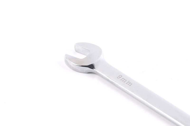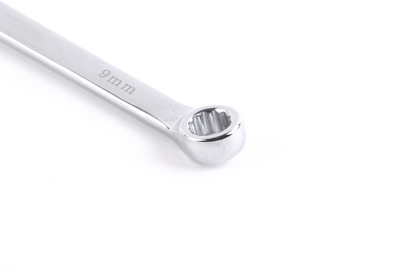 6-point/12-point/all drive function on ring side available. Regular/quick function on open side available .15º on ring sides and open side. Size: 9 mm. Length: 155mm Material: Chrome vanadium