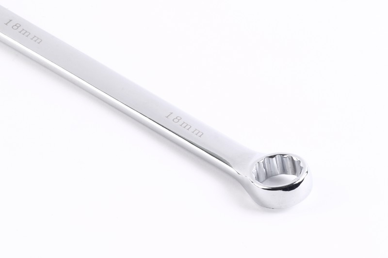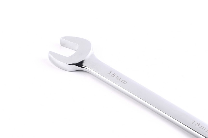 6-point/12-point/all drive function on ring side available. Regular/quick function on open side available .15º on ring sides and open side. Size: 18mm. Length: 228mm Material: Chrome vanadium
