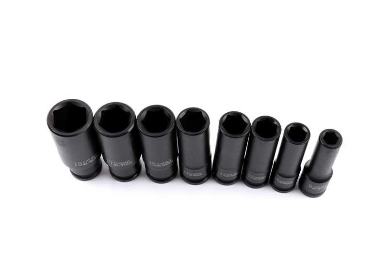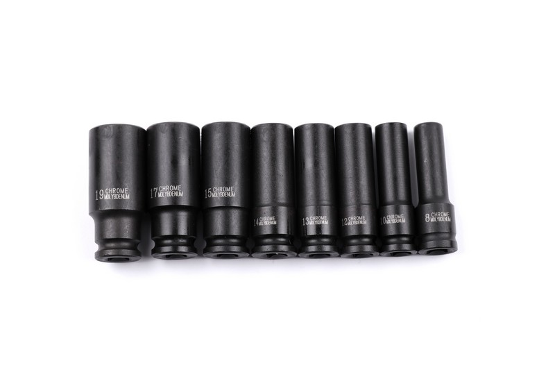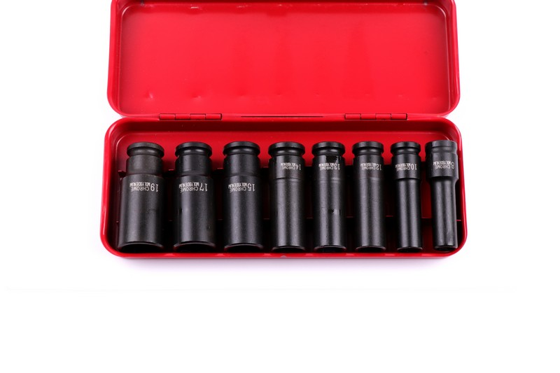 Square drive size: 3/8”(9.5mm). Size: 8-10-12-13-14-15-17-19mm. Length: 63mm. Material: Chromium Molybdenum Packaging: metal case