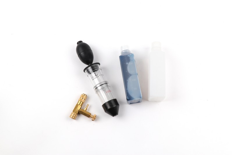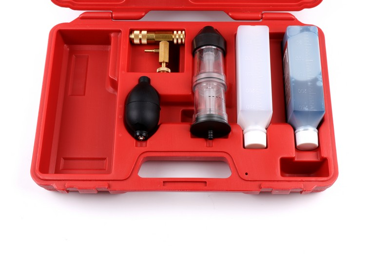 Rubber bulb. Adapter to connect the vertical chambers with the radiator caps,includes knob to release pressure.Vertical chambers with V shape rubber adapter. CO2 test liquid.