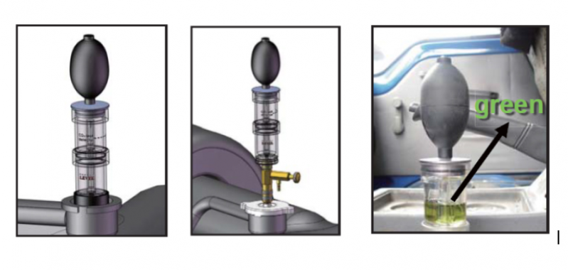 Tester fluid changes from blue to green or yellow if CO2 is present in coolant.
