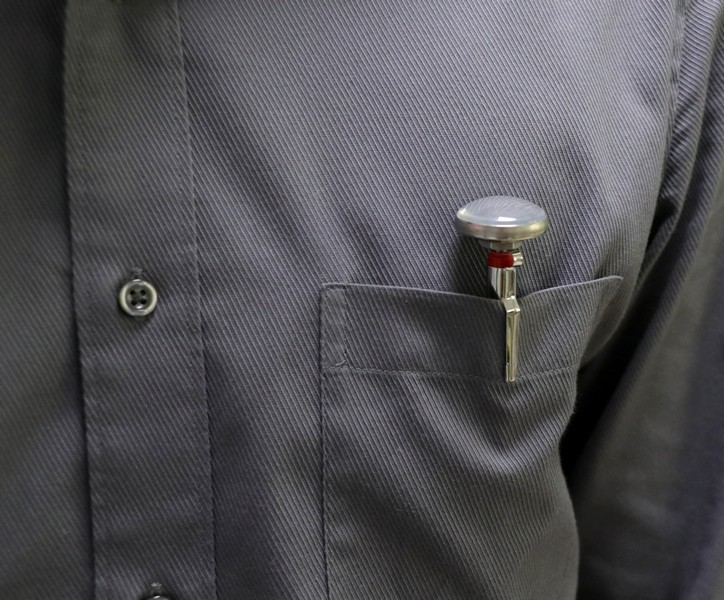 It is a portable thermometer with a pen type case with a clip that can be inserted into pocket of work clothes and also into wall pocket.