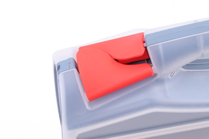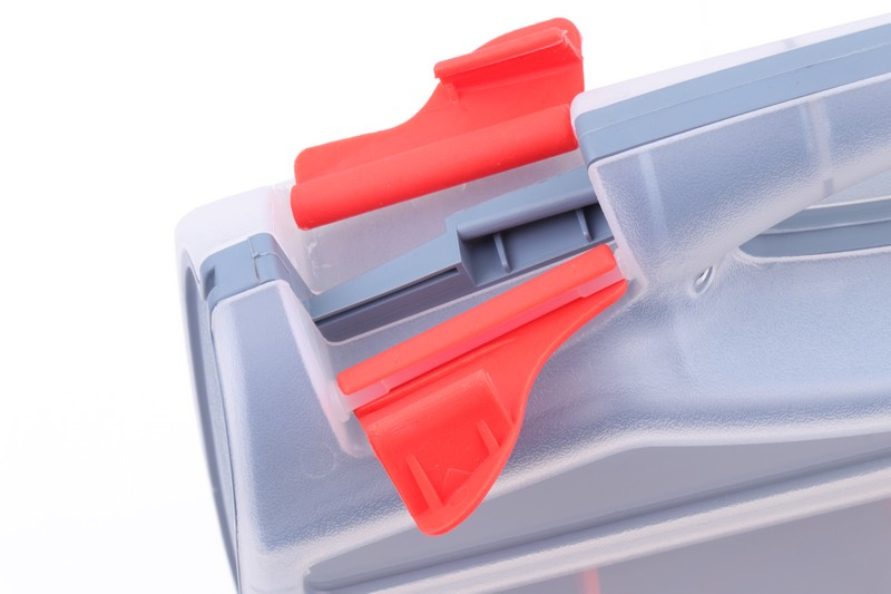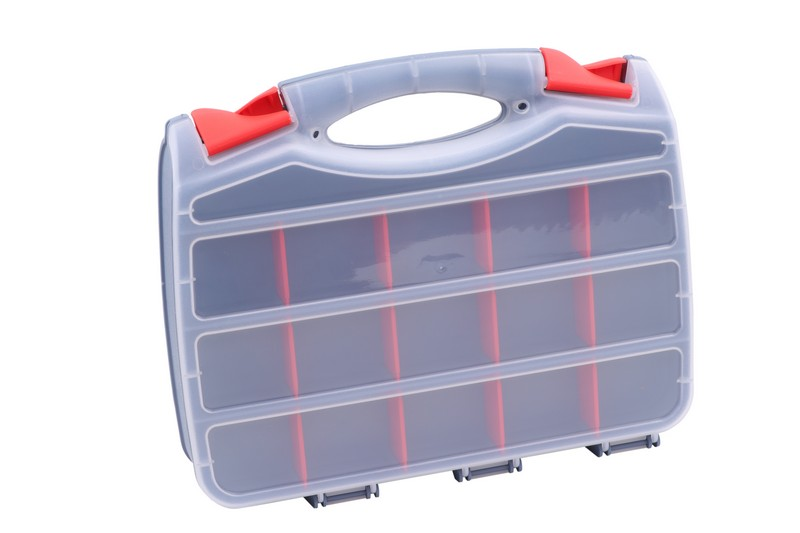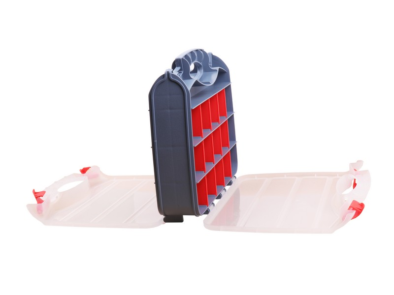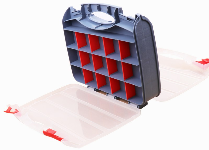 The plastic gray body with double-sided parts box. With red partitions that can be removed, it can be divided into blocks of up to 16 on one side. Size: 315 × 265 × 75 mm Material: PP