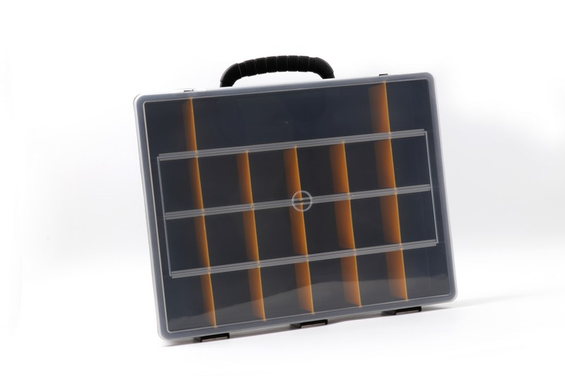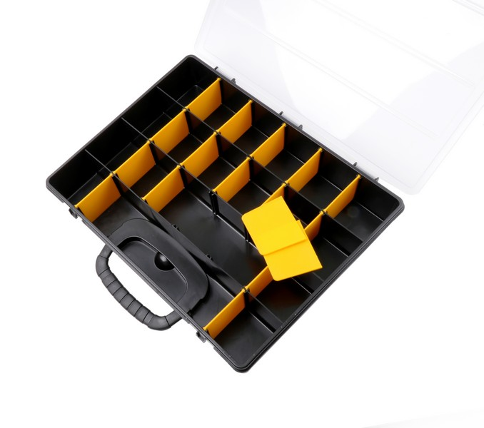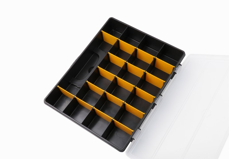 It can be divided into up to 21 blocks on one side with yellow partitions that can be removed. Size: 360 × 290 × 65 mm Material: PP