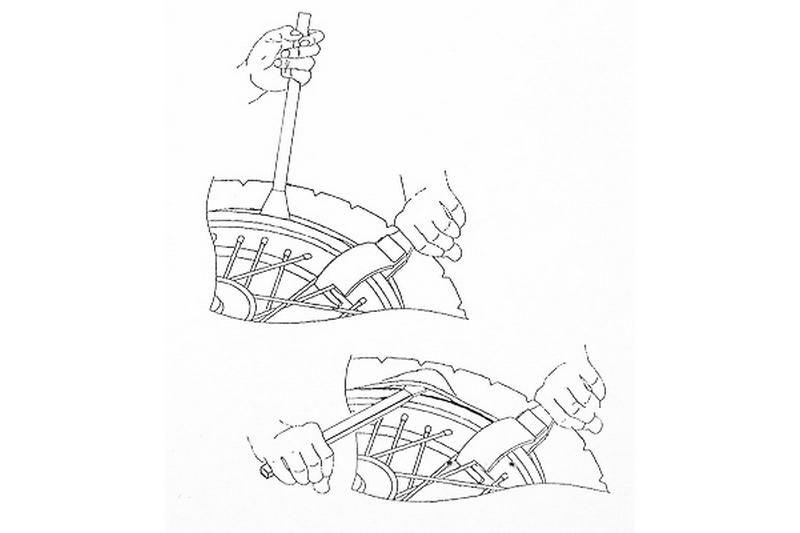 Slip the slot of the tool over the spoke and push bead down on opposite side of tire from tire irons.