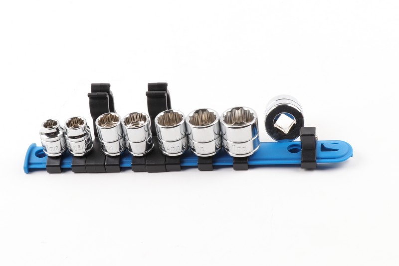 8 pcs 3/8”dr. 12pt socket: 8-10-12-13-14-15-17-19mm Length: 20mm(8mm),22mm(10mm),24mm(12~15,17,19mm) Material: Chrome vanadium