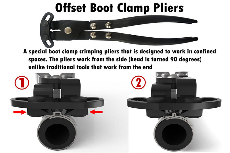 A SPECIAL BOOT CLAMP CRIMPING PLIER DESIGNED TO WORK IN CONFINED SPACE. USE PLIER PARALLEL TO THE BOOT TO CRIMP THE CLAMP. UNIQUE OFFSET DESIGN ALLOWS YOU TO WORK ON CLAMPS ON LARGE SIZE BOOTS. TOP PLATE ON PLIERS FLATTENS CRIMP. WORKS ON MOST ALL EAR-TYPE CLAMPS EXCEPT THOSE REQUIRING A TORQUE READING.
