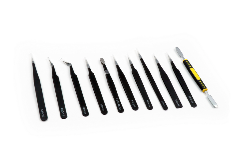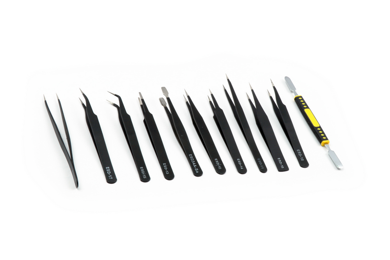 INCLUDING - 1PCS SCRAPING KNIFE TIN, 10PCS PRECISION TWEEZERS - Size: ESD-10: (123mm); ESD-11: Supper fine tip and straight (141 mm); ESD-12: Fine tip straight (134mm); ESD-13: Fine and Round (122mm); ESD-14: Fine tip straight (121mm); ESD-15: Fine tip curved (120mm); ESD-16: Fine tip straight (125mm); ESD-17: Fine tip curved (122mm); ESD-34A: Sqr head heavy-weight pointed tip (119mm). ESD-18(125mm)