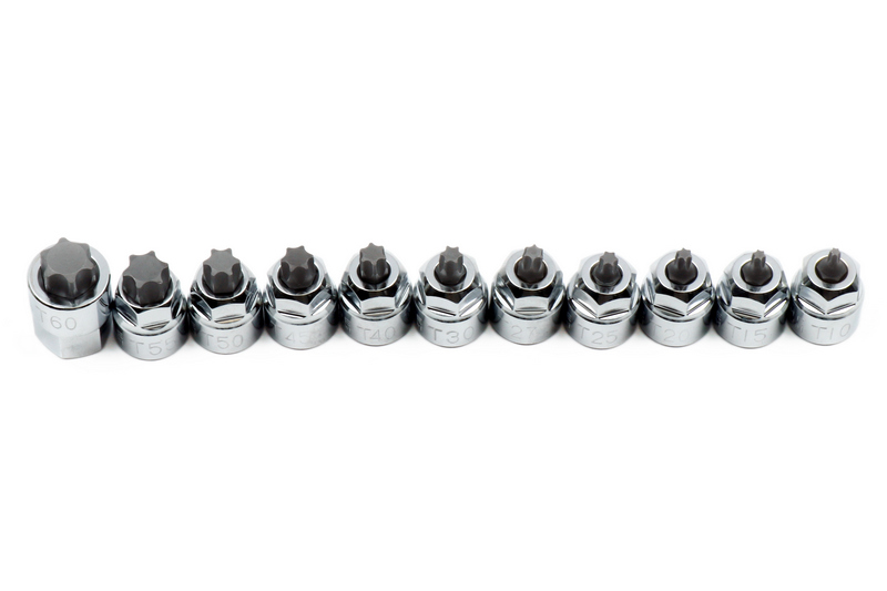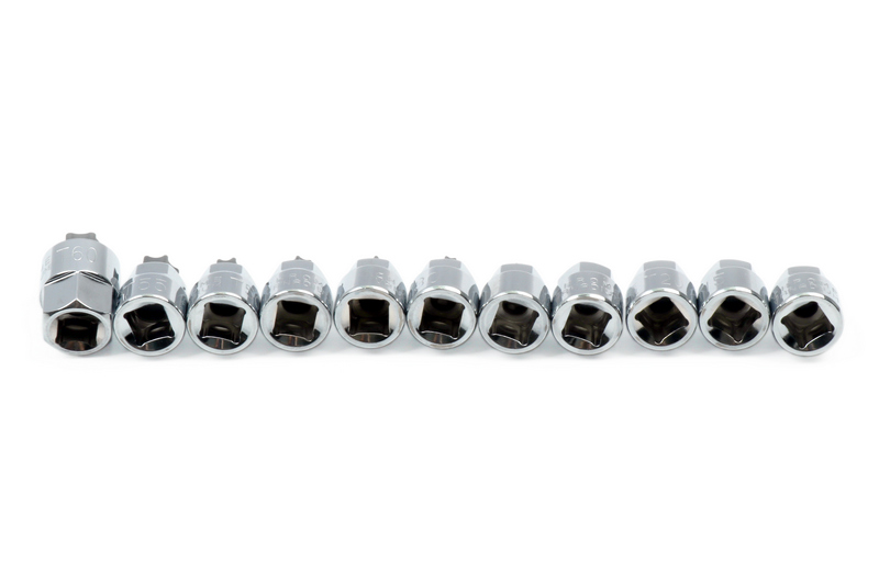 11PC ULTRA STUBBY STAR BIT SOCKET SET 3/8"dr T10,15,20,25,27,30,40,45,50,55,60 Material: Socket-50BV30, Chrome Knurled Bit-S2, Zinc phosphate