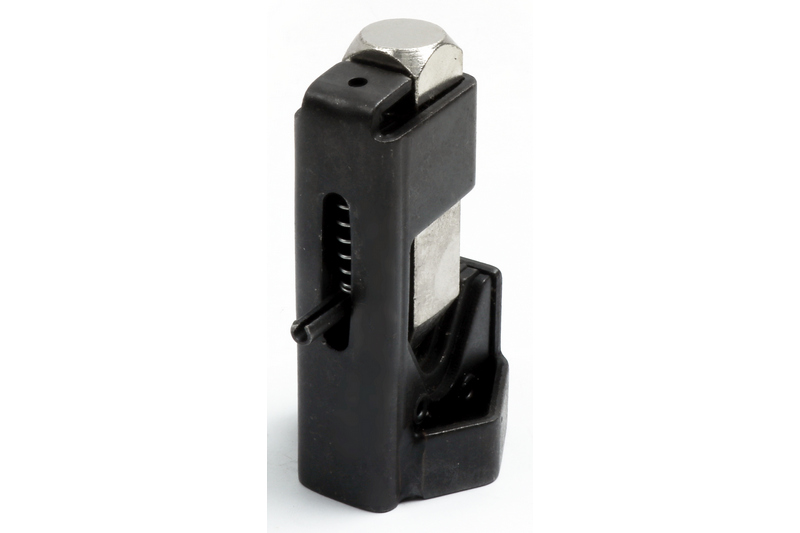 Spring loaded and only requires a hammer and solid surface to operate.