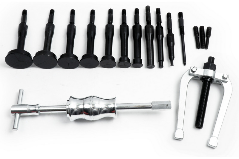 [16 PCS] This blind bearing puller set includes a sliding hammer, puller, spare pin bolt, 3 screw adapters, and 10 split collets