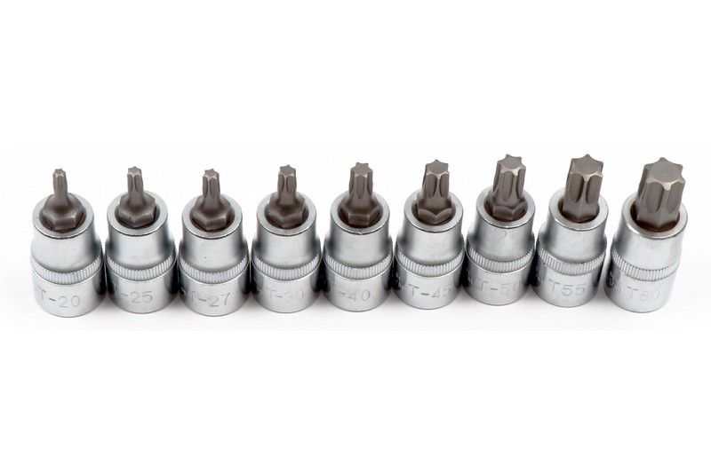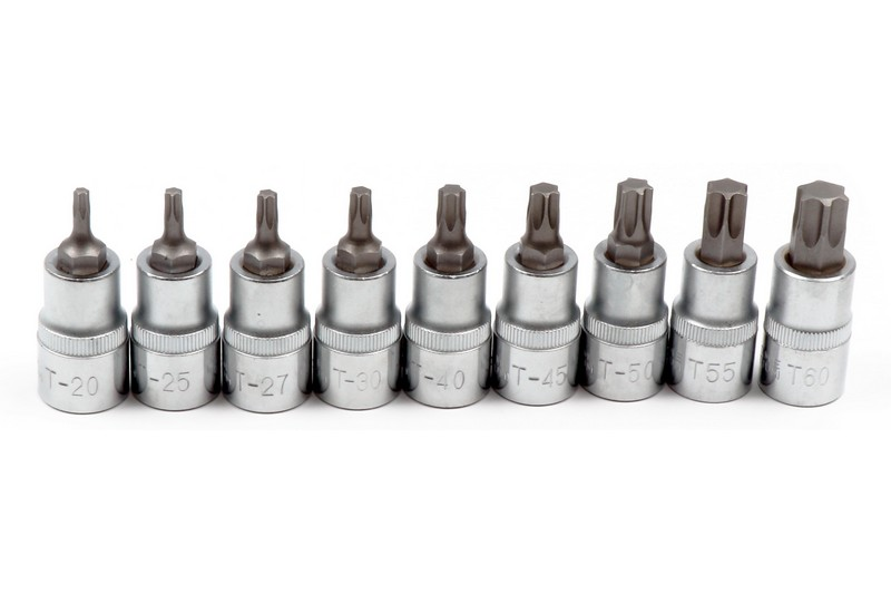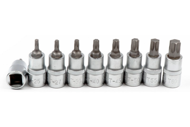 1/2 DR. 9PCS STAR BIT SOCKET SET SIZE: T20,T25,T27,T30,T40,T45,T50,T55,T60 Material: Chrome Vanadium Length: 55mm