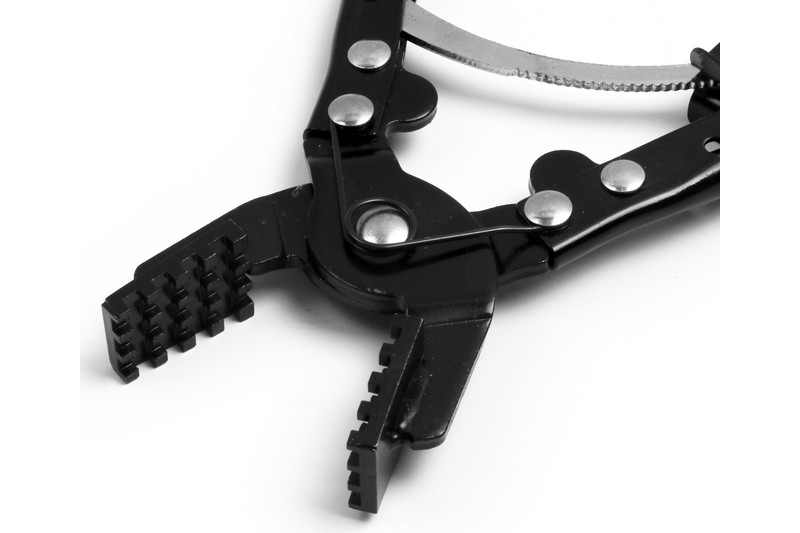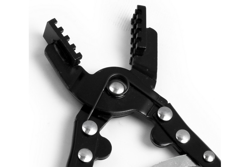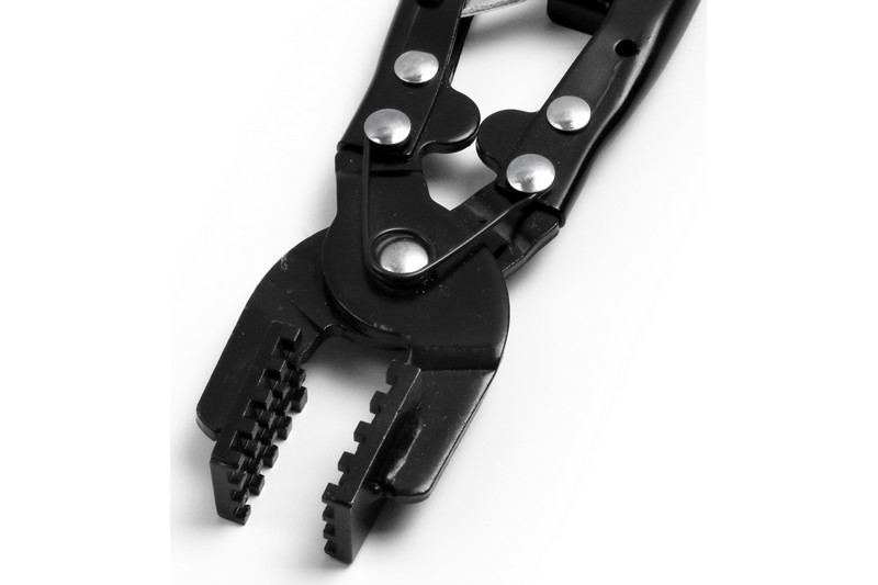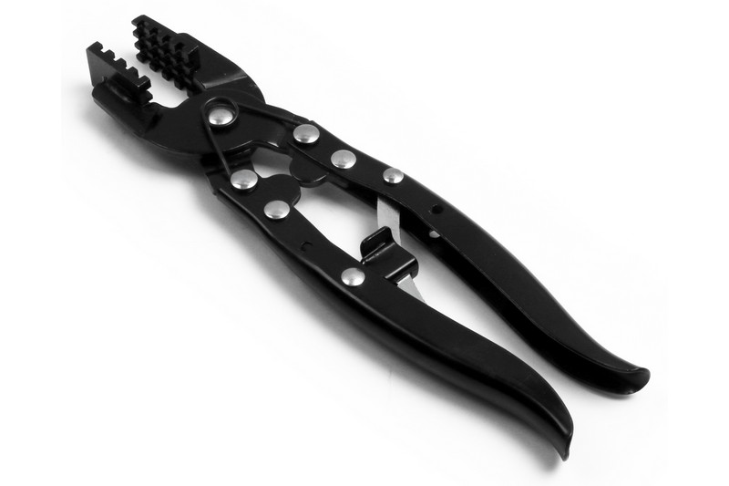 Hose clamp pliers with special waffle shape of jaws securely reaches, grabs, removes or locks hose clamp in place.