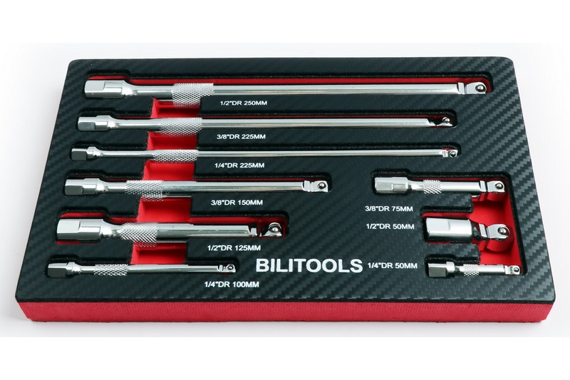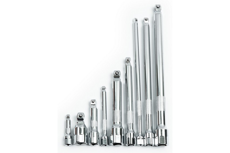A comprehensive, 9 piece wobble extension bar set. Includes 1/4" Dr. bar lengths: 50-100-225 mm; 3/8"Dr. bar lengths: 75-150-225 mm ; 1/2"Dr. bar lengths: 50-125-250 mm.