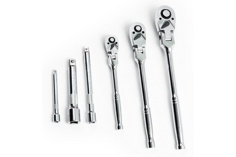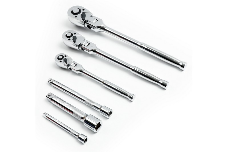 This set includes 1/4", 3/8", 1/2" drive flex-head ratchets and corresponding extension bars.