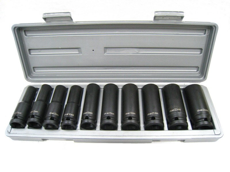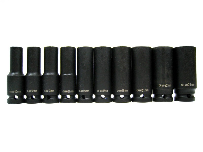 Square drive size:1/2”(12.7mm). Socket shape: 6PT . Size: 10-12-13-14-15-17-19-21-22-24mm. Length: 78mm Material: Chromium Molybdenum PACKING: GRAY BMC