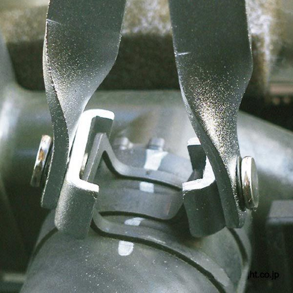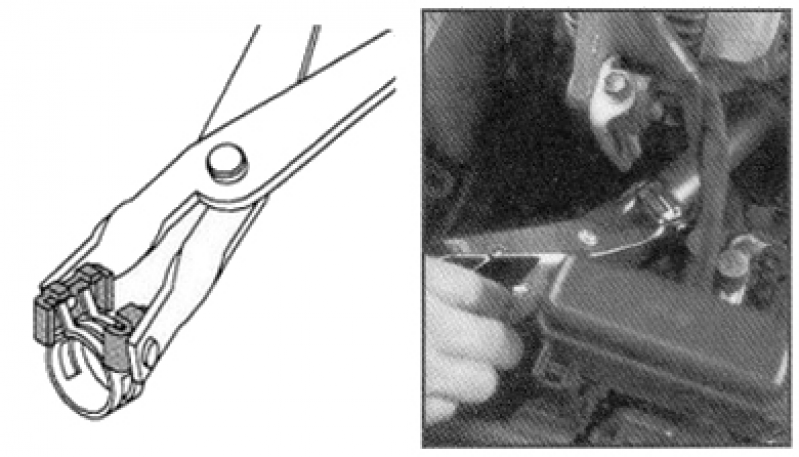 A hose clamp plier that removes the brake, fuel, and vacuum hose bands.