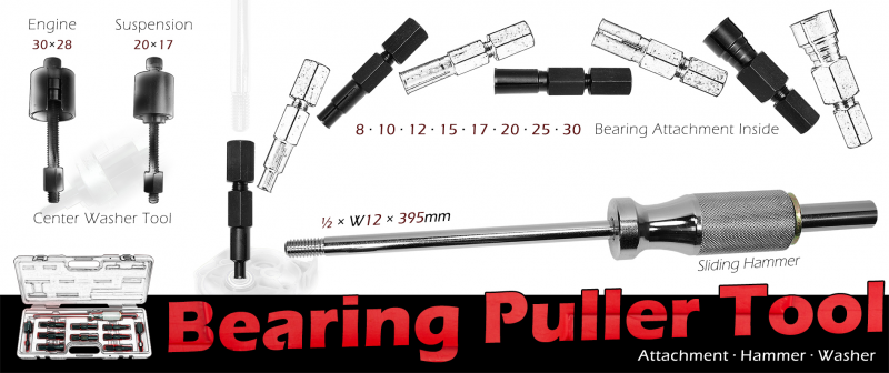Center Washer Tool: Engine 30x28mm, Suspension 20x17mm. Bearing Attachment Inside: 8-10-12-15-17-20-25-30mm. Sliding Hammer: 1/2xw12x395mm.