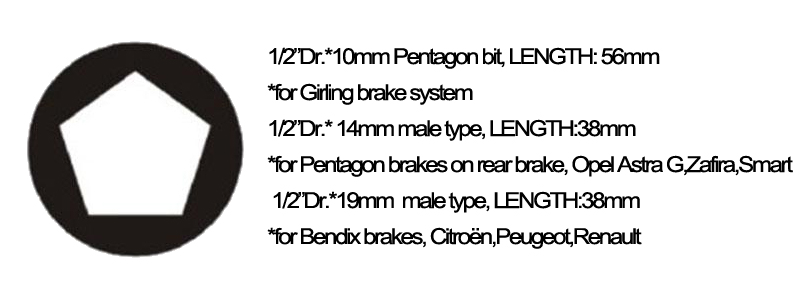 1/2”Dr.*10mm Pentagon bit, LENGTH: 56mm for Girling brake system .