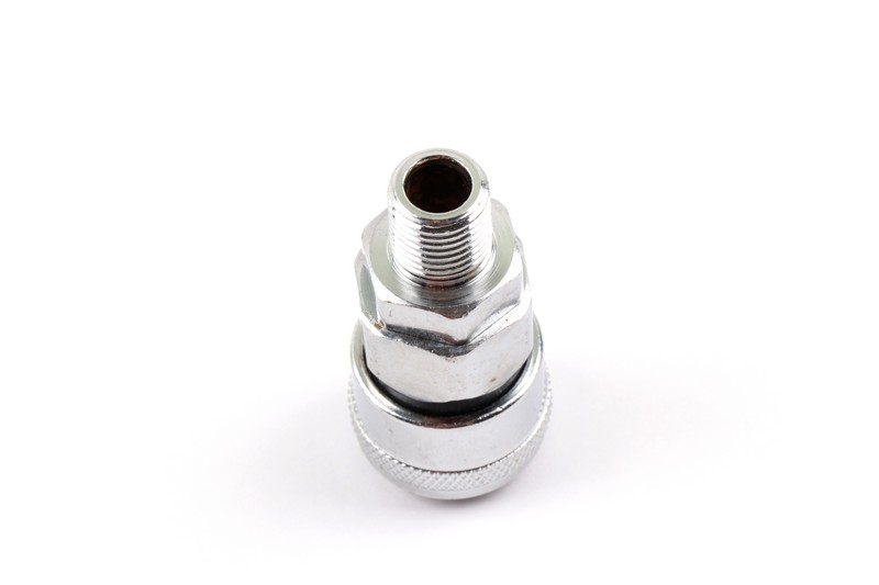 Male screw type air coupler. Inlet size: 1/4 "PT Size: 22SM Total length: 56 mm Material: Steel Surface treatment: Chrome plating Packing: plastic bag