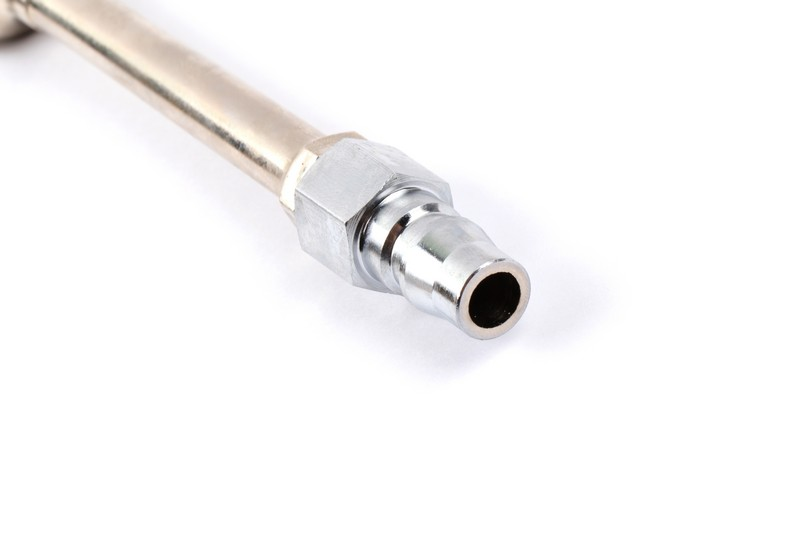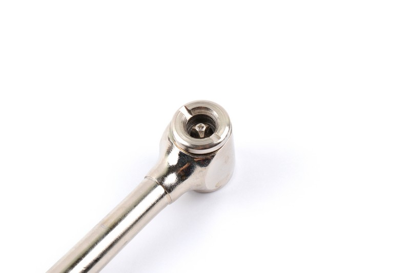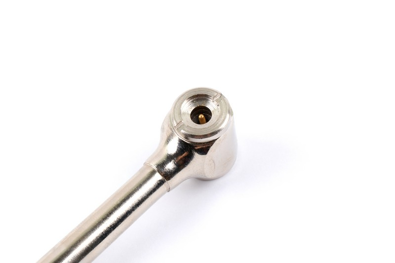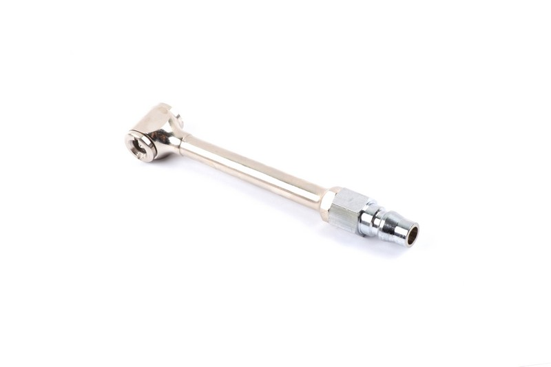 Dual head chuck for car and bike. Zinc material / nickel plated. Schrader And Dunlop Spec. & Presta Spec. Overall length: 143mm. Weight: 50g Accessory: Plug for rubber hose