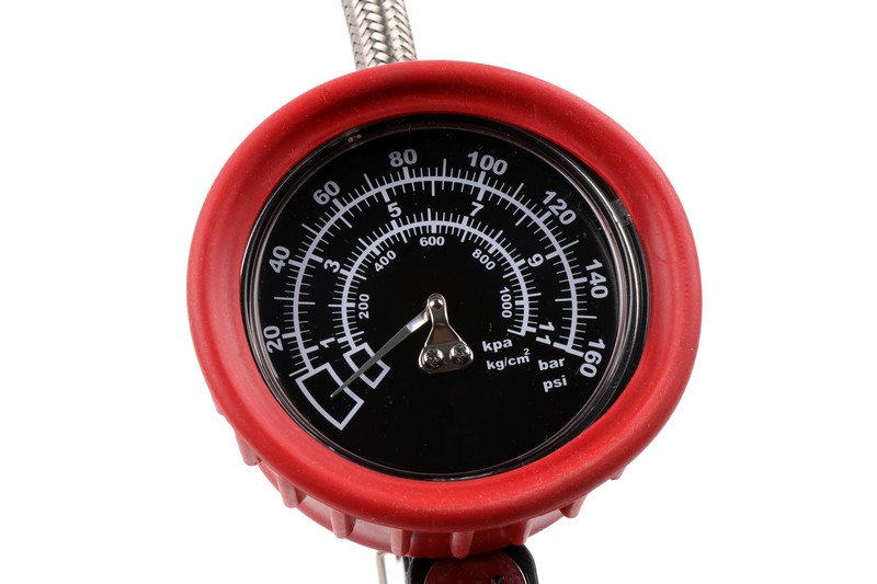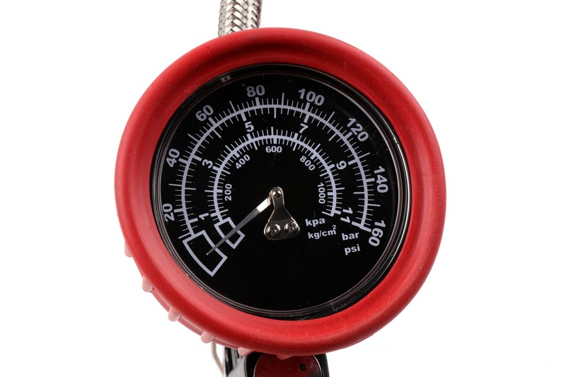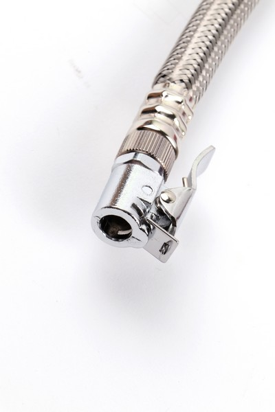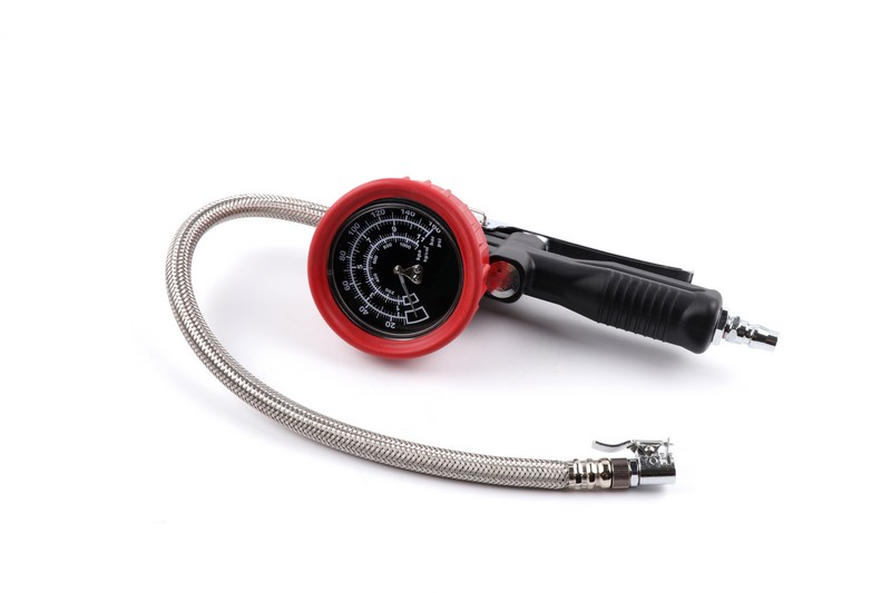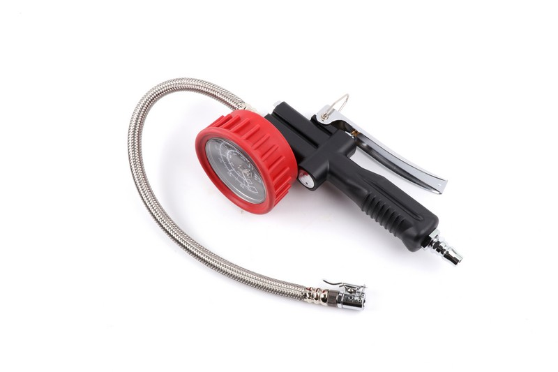 Dial Diameter: 3 inch. Pressure Range: Air. Pressure Range:160psi.Lens: Acrylic. Protector: Red Rubber. Hose: Stainless steel Φ13*400mm. 360° swivel chuck. Clamp Chuck. Lever: Chrome-plated steel.
